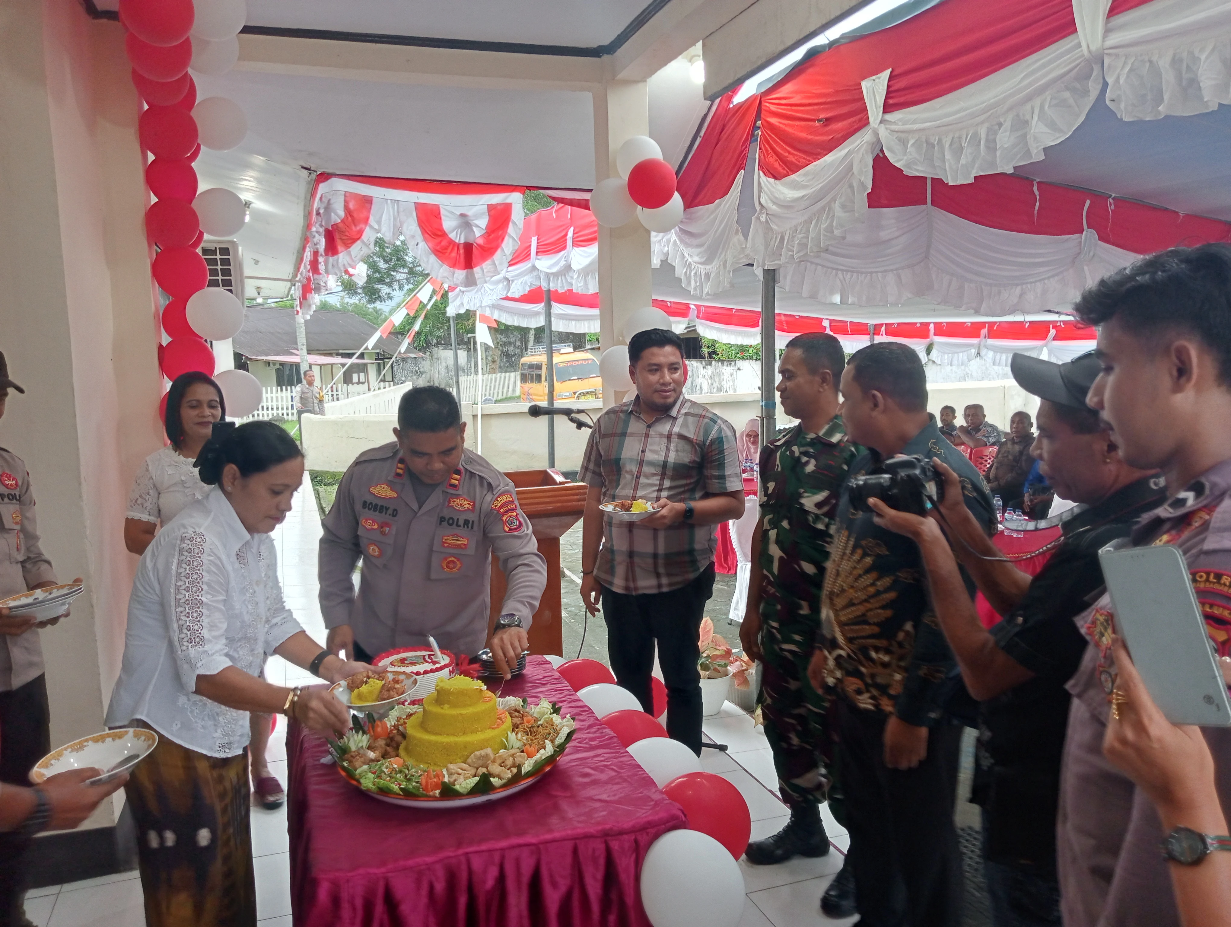 Perayaan syukuran HUT Bhayangkara yang di laksanakan tepatnya di teras depan Mapolsek Seram Barat itu, di warnai dengan hiburan musik oleh artis - artis lokal Maluku, serta di hiasi dengan pemotongan Nasi Tumpeng sebagai lambang ucapan syukur HUT Bhayangkara ke - 78. (V374)