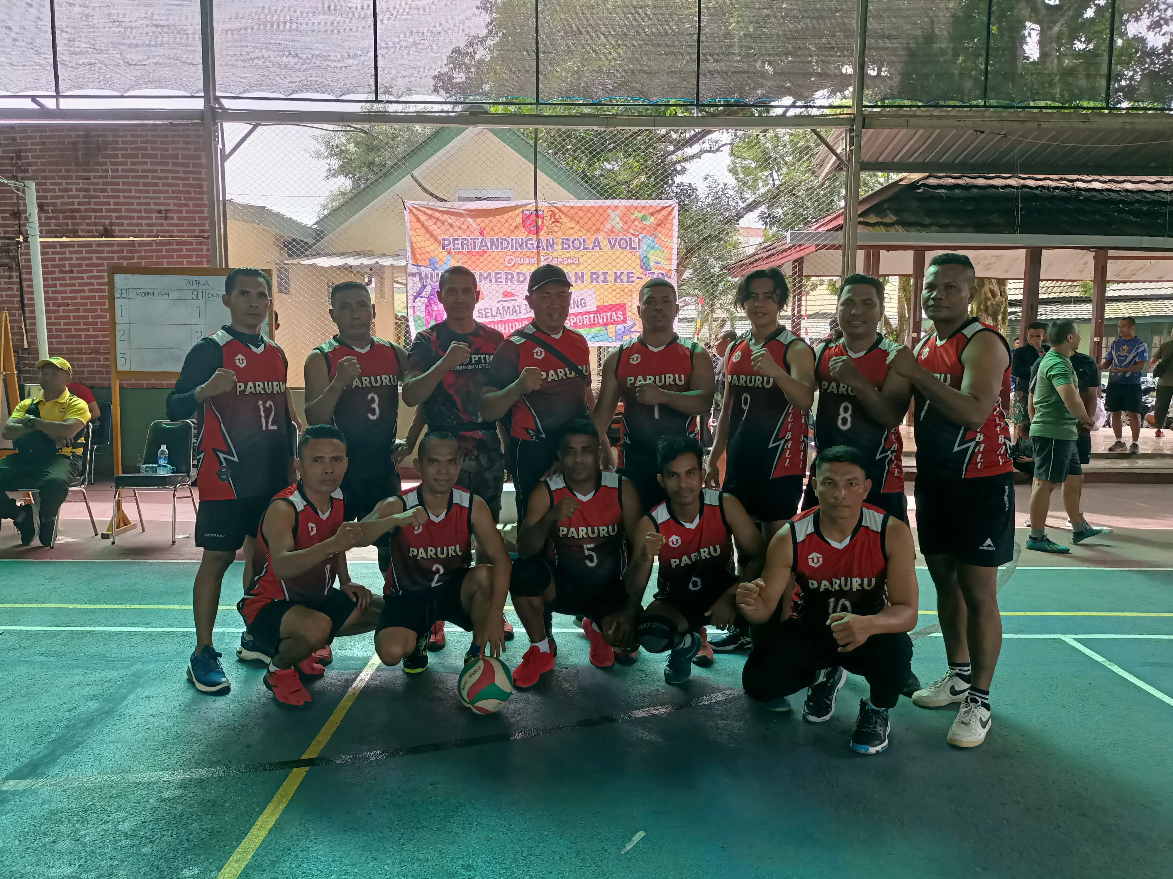 Menang 2-1 dengan score 25-19, 19-25, dan 15-12 adalah hasil akhir yang diraih oleh Tim Bola Volly Paruru Kodim 1504/Ambon, hal ini adalah hasil kerja keras tim dan Satuan Kodim 1504/Ambon juga sporter yang sangat antusias dalam mendukung pertandingan.
